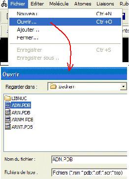 de la famille 2.7 de Rasmol, Le mode de fonctionnement est bien compris à travers des exemples présentés sous forme de projets: Après l'ouverture du logiciel RasTop, il faut ouvrire une structure moléculaire (formats .pdb ou .ent) en activant la commande "Fichier" / "Ouvrir" (voir ci contre). La banque de données (Protein Data Bank) du site web Protein Data Bank (http://www.rcsb.org/pdb/) vous permet de télecharger des protéines de votre choix qui ne sont pas sur la liste des exemples disponible sur ce CD. Modification de l'affichage Contrairement au logiciel RasMol, des boutons spécifiques permettent de modifier l'affichage de toute la molécule chargée par RasTop. Par exemple, on peut passer d'unaffichage en 'fil de fer' (wireframe) à un affichage en 'sphères et batonnets' (ball and stick) Coloration des chaînes: Afin de mettre en évidence les détails d'une molécule (chaînes, ligands, héteroproteines,...) rien ne vaut qu'une coloration par chaîne. Pour cela exécuter dans l'ordre: Atoms --> Color ---> Chain. Ainsi, la coloration des chaînes permet de bien distinguer le substrat dans un complexe enzyme-substrat. Voir des exemples plus loin. Utilisation du zoom et des curseurs Pour diagnostiquer la molécule, l'utilisation du zoom et des déplacements 3D deviennent obligatoires. |
