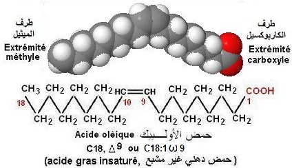 - Les acides gras insaturés (أحماض دهنية غير مشبعة) comportant une ou plusieurs liaisons doubles carbone-carbone.